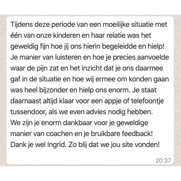 Via de oranje knop op deze pagina kun je direct een afspraak in mijn agenda plannen. Komen de beschikbare dagen of tijden niet uit? Stuur dan een berichtje naar 06-29101039 of mail naar ingrid@jit.nl. Dan bekijken we samen de mogelijkheden. Telefonisch ben ik minder goed bereikbaar, maar ik reageer zo snel mogelijk op je bericht. Graag tot binnenkort.
